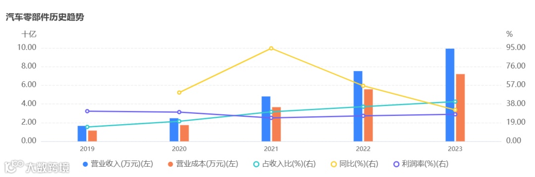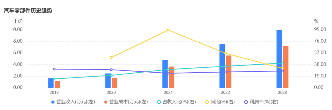 随着新能源汽车销量的增长,三花智控的汽车零部件业务占比也从2020年的20.39%提升至2023年的40.37%,对应营收从24.69亿增长到99.14亿。