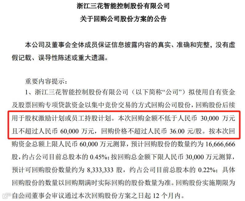 2024年12月31日,三花智控宣布回购方案,拟回购金额不低于3亿不超过6亿,回购价格不超过36元/股,回购股份后续用于股权激励或员工持股,使用自有资金及股票回购专项贷款资金。