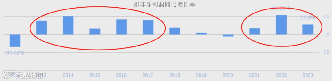 过去十多年三花智控业绩的持续高复合增长率,其实可以分成两个阶段来看,第一个阶段是2013年至2017年,第二个阶段是2021年至2023年,这两个阶段才是三花智控扣非净利润明显加速的时候。