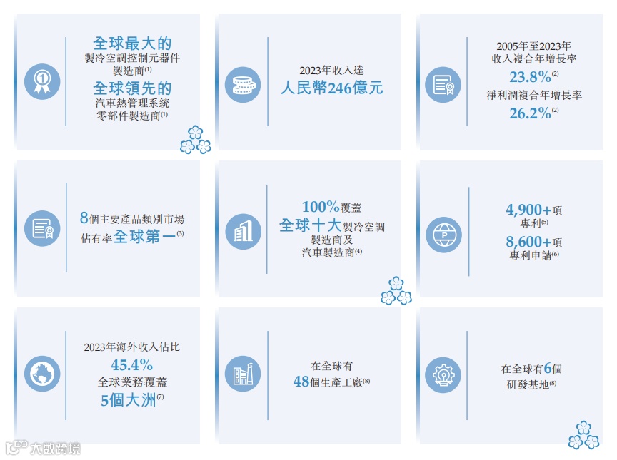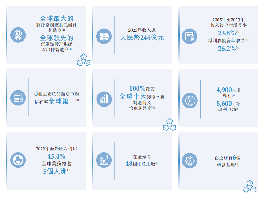 在向港交所提交的申请材料中三花智控以相当显眼、清晰的形式展示了公司在全球的地位、经营成果、成长能力等关键指标,“全球最大的”“全球领先的”“全球第一”“全球十大”等字眼尤其显眼。