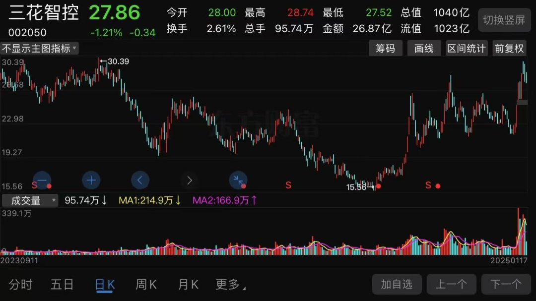 实际上,三花智控宣布回购后,二级市场股价先是连跌两天,然后反弹,从最低21.8元涨至29.95元,大涨超37%。