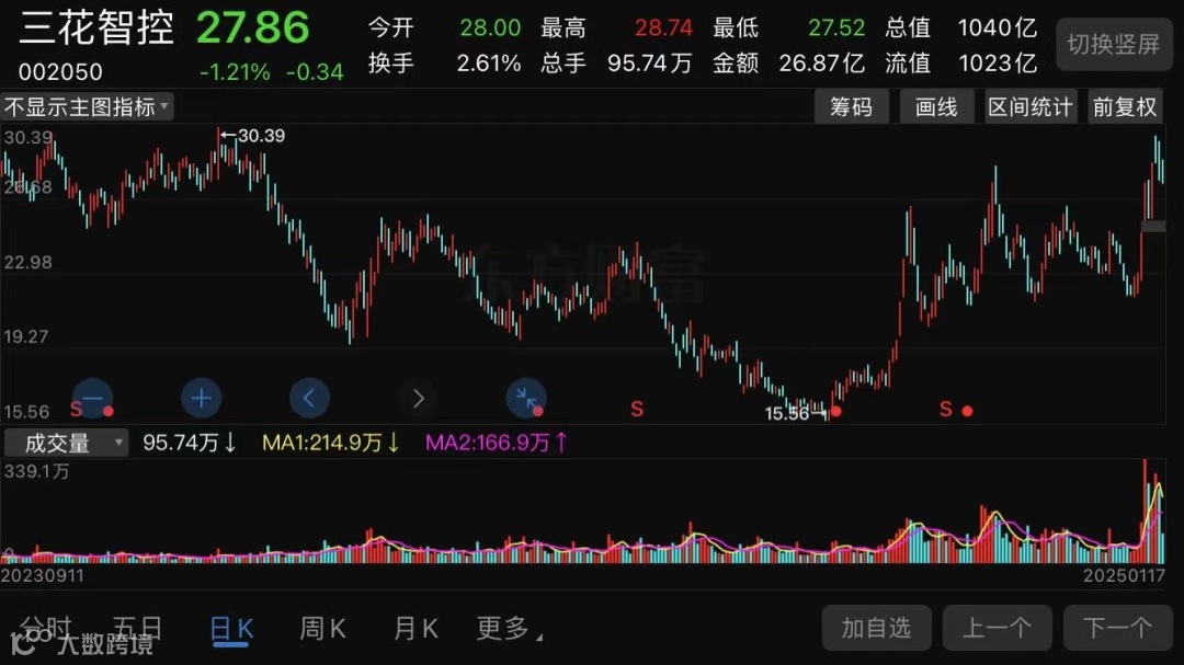 近期,三花智控的股价最高触及29.95元,较2024年8月底的最低15.56元已经大涨超92%,接近翻倍。这也就意味着,三花智控的市值一度触及1117.73亿,从2024年8月底以来市值已经飙涨537亿。
