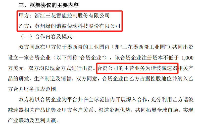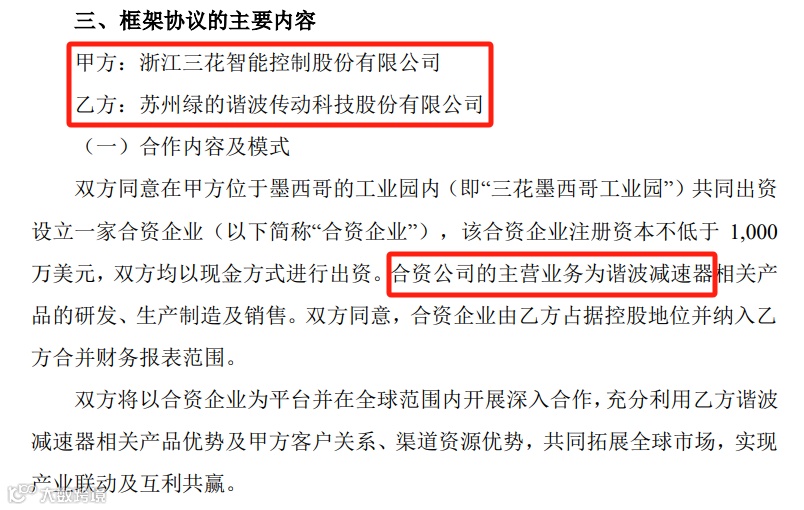 实际上,三花智控已于2023年4月与绿的谐波合作在三花智控墨西哥工业园合资成立一家主营谐波减速器的公司。