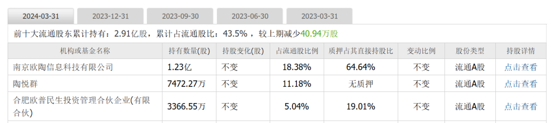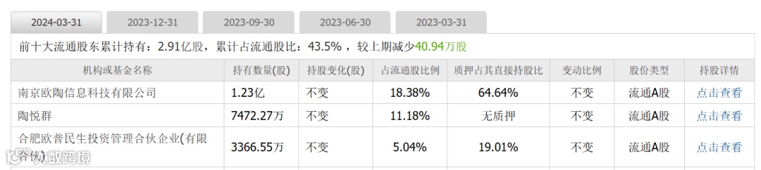 除了减持套现,股权质押这种变相套现行为也被用上了。截至目前,持股1.23亿的第一大股东南京欧陶信息科技有限公司已经将其所持公司股份的64.64%质押,欧普民生也将其持股的19.01%质押。