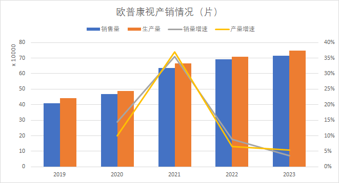 可以看到,随着欧普康视产品价格的持续上涨,虽然产销量整体也还是在增长,但是整体增幅已经出现断崖式下跌,特别是2022年销量增速一下从36.94%的高位放缓至6.5%的个位数水平,2023年继续放缓至5.25%。