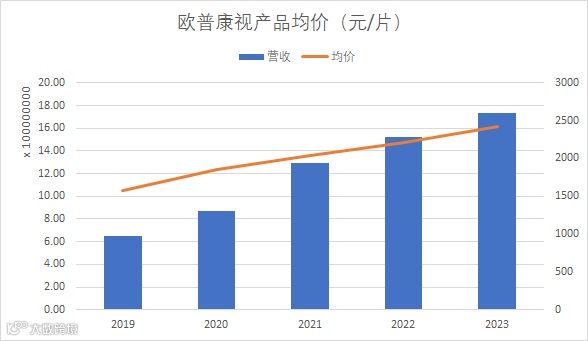 根据欧普康视财报披露的营收、销量计算产品均价,2019年时的均价还不到1600元/片,到2023年均价已经涨到超过2428元/片的价格,4年涨价超50%,每年平均稳定涨价200元/片。