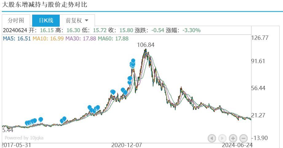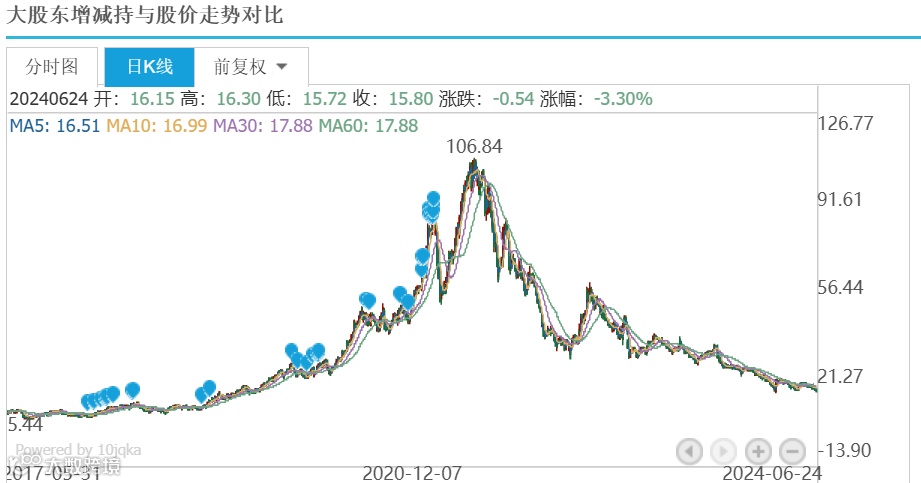 大家可以通过下面这个对比图看一下欧普康视大股东的减持情况,以及他们减持时的股价所在位置,蓝点为减持行为发生:
