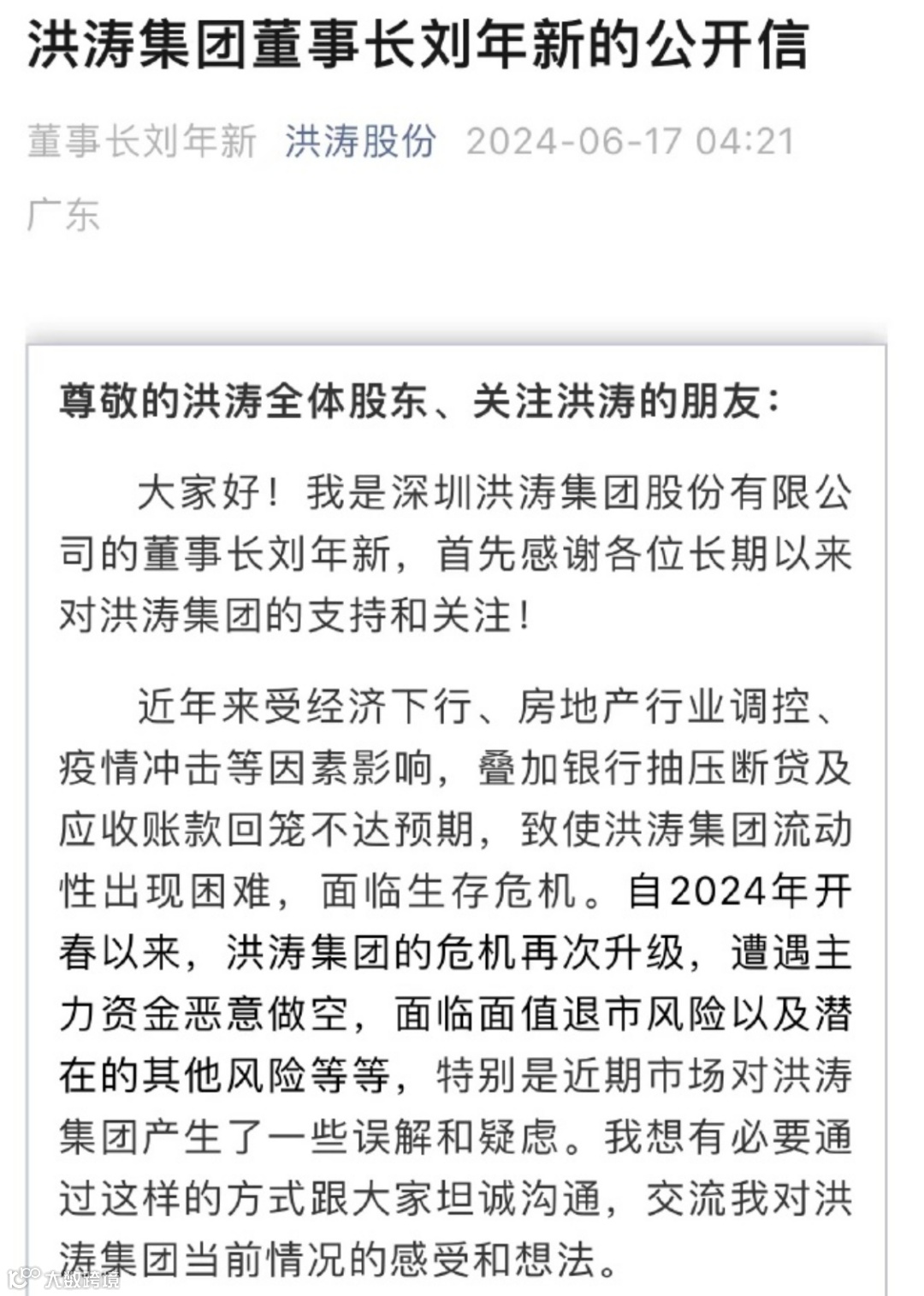 6月17日凌晨4点多,A股著名建筑装饰公司洪涛股份,在公司的微信公众号上发布了一则董事长刘年新的公开信,称自2024年开春以来,集团的危机再次升级,遭遇主力资金恶意做空,面临面值退市风险以及潜在的其他风险等等。