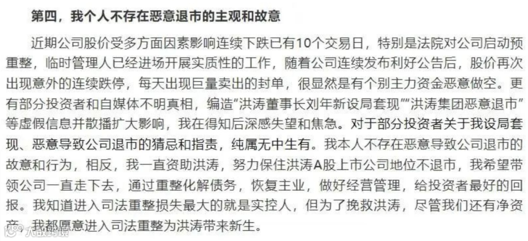 对于市场上流传的“刘年新设局套现、“洪涛集团恶意退市”一说,刘年新坚决否认,称这纯属无中生有,自己还是要坚决保住洪涛的上市公司地位。