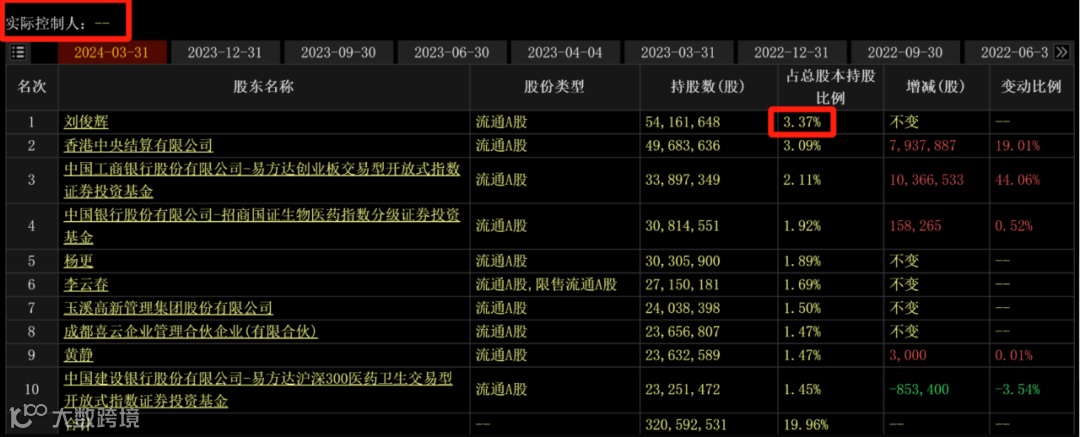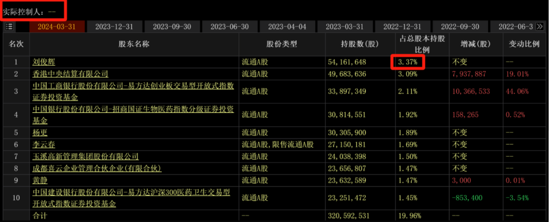 沃森生物方面,就更有意思了,因为公司高管减持的过多,已经减到没有了实控人,第一大股东刘俊辉的持股比例更是仅有3.37%。