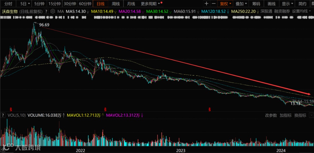 而沃森生物跟它们比起来跌的更狠了,它从2021年8月历史最高价96.69元开始,几乎是一口气不带什么反弹跌下来的,到现在股价还不到14元,跌幅高达85%以上!