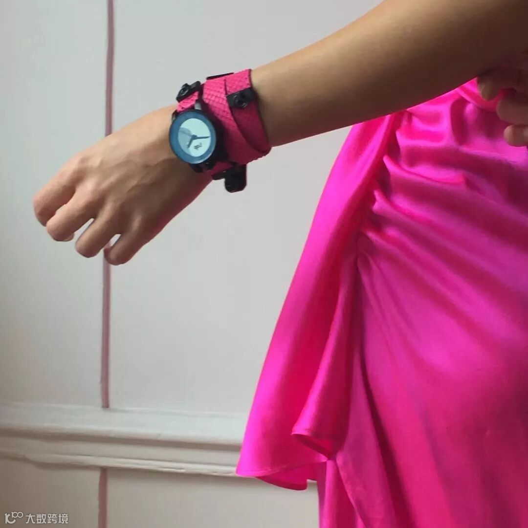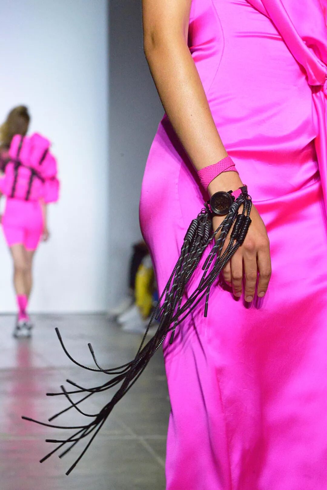 设计上我们采用了龙纹和蜥蜴纹来做表带的詮釋,2019春夏最重要的颜色是荧光桃红色作为主题色。材料上选择了环保羊皮做细蟒蛇纹来呈現合作款表带,我们也在表带上面加上了金属环装饰可以呼应表壳质感。同时又能够增加整个商品更丰富的一个饰品的装饰度。在ANGEL CHEN的伸展台上,流苏从表带上飘散出来具有非常抢眼的效果,如同龙须一般将时尚和国风融合。这次怀表采用玉石作为配件的主要元素,玉石古典温婉的美让怀表打破了全席金属材质的风格。