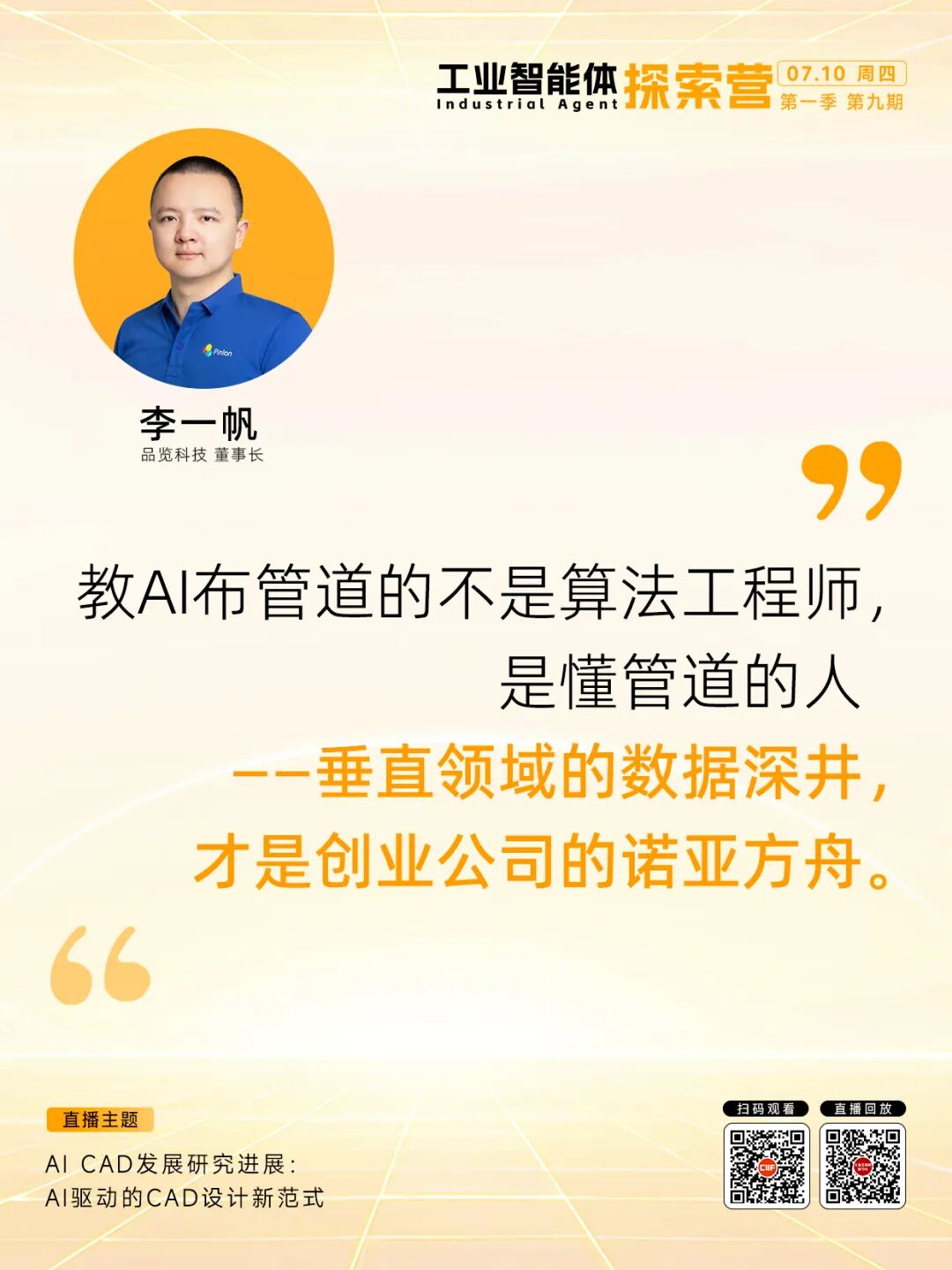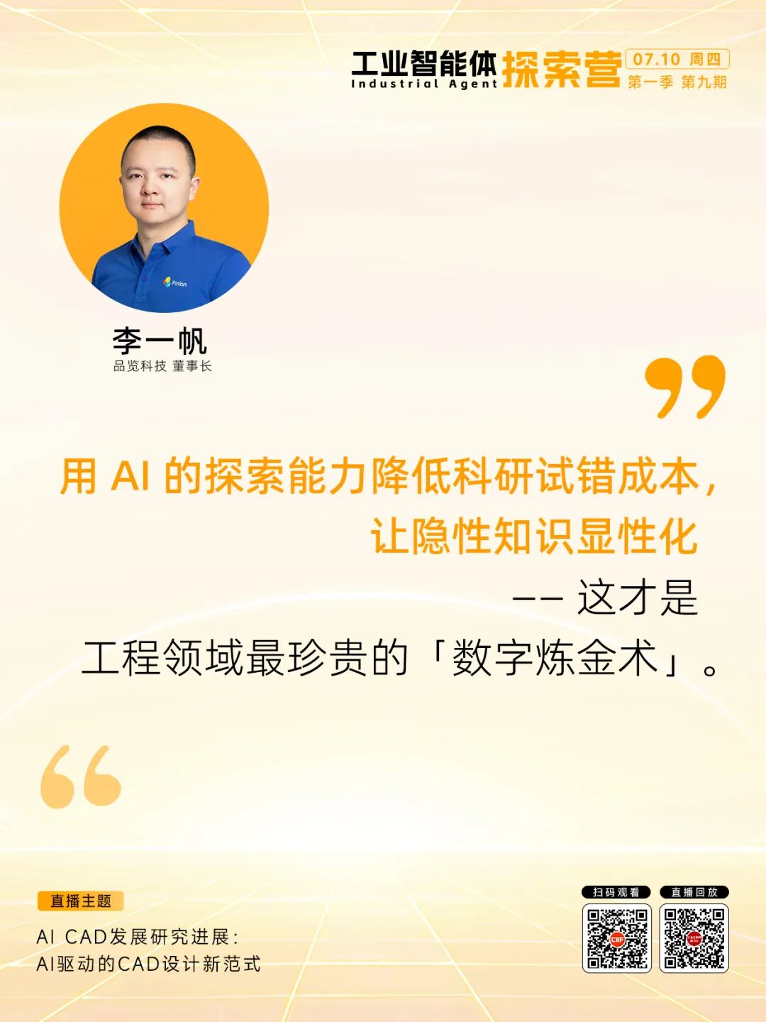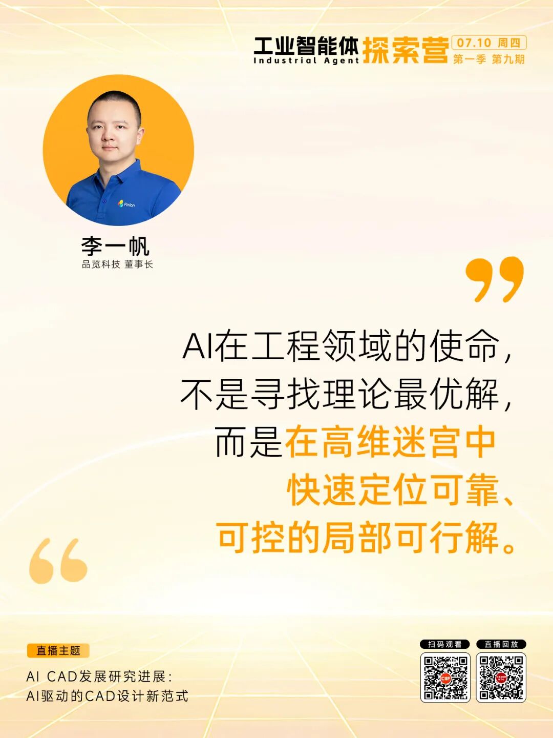 7月10日,「品览科技 董事长 李一帆」做客探索营,分享由AI驱动的CAD设计新范式。