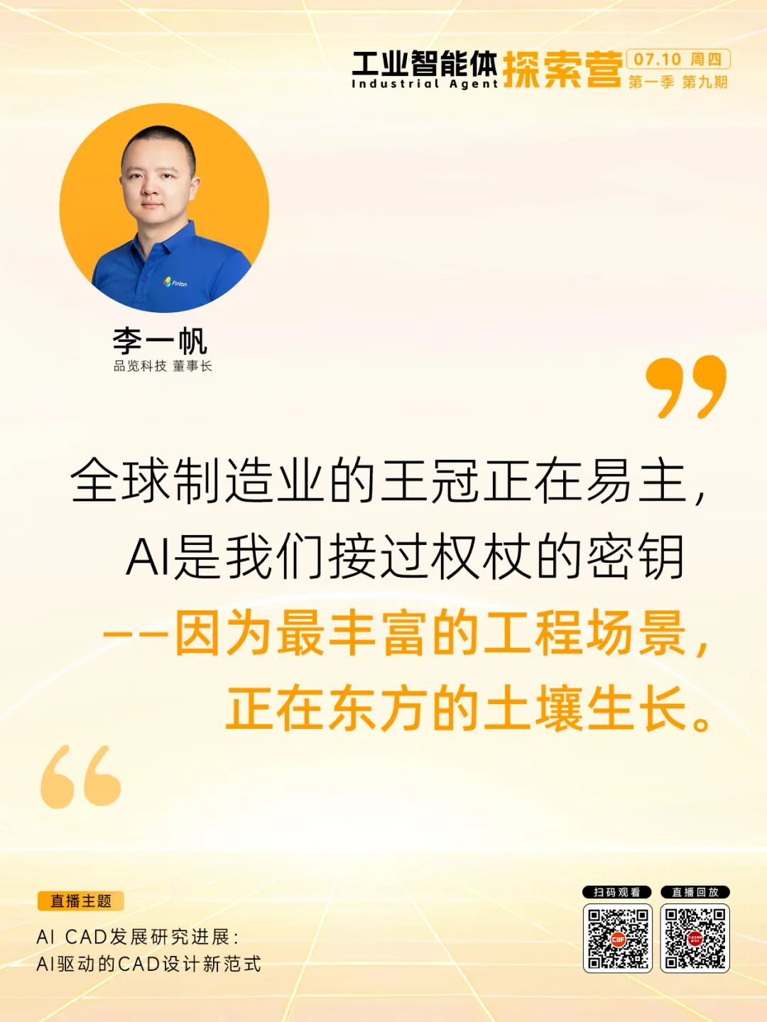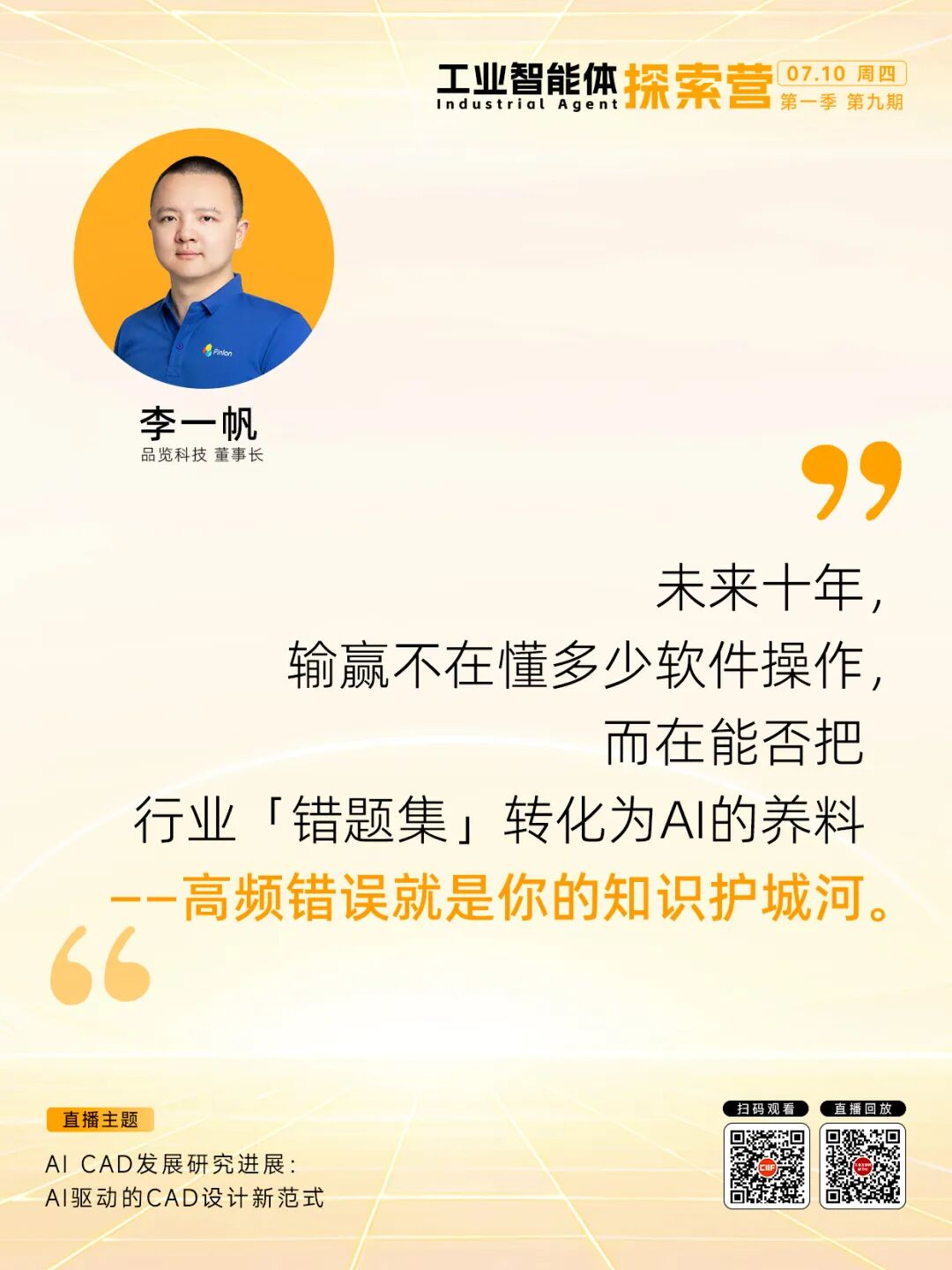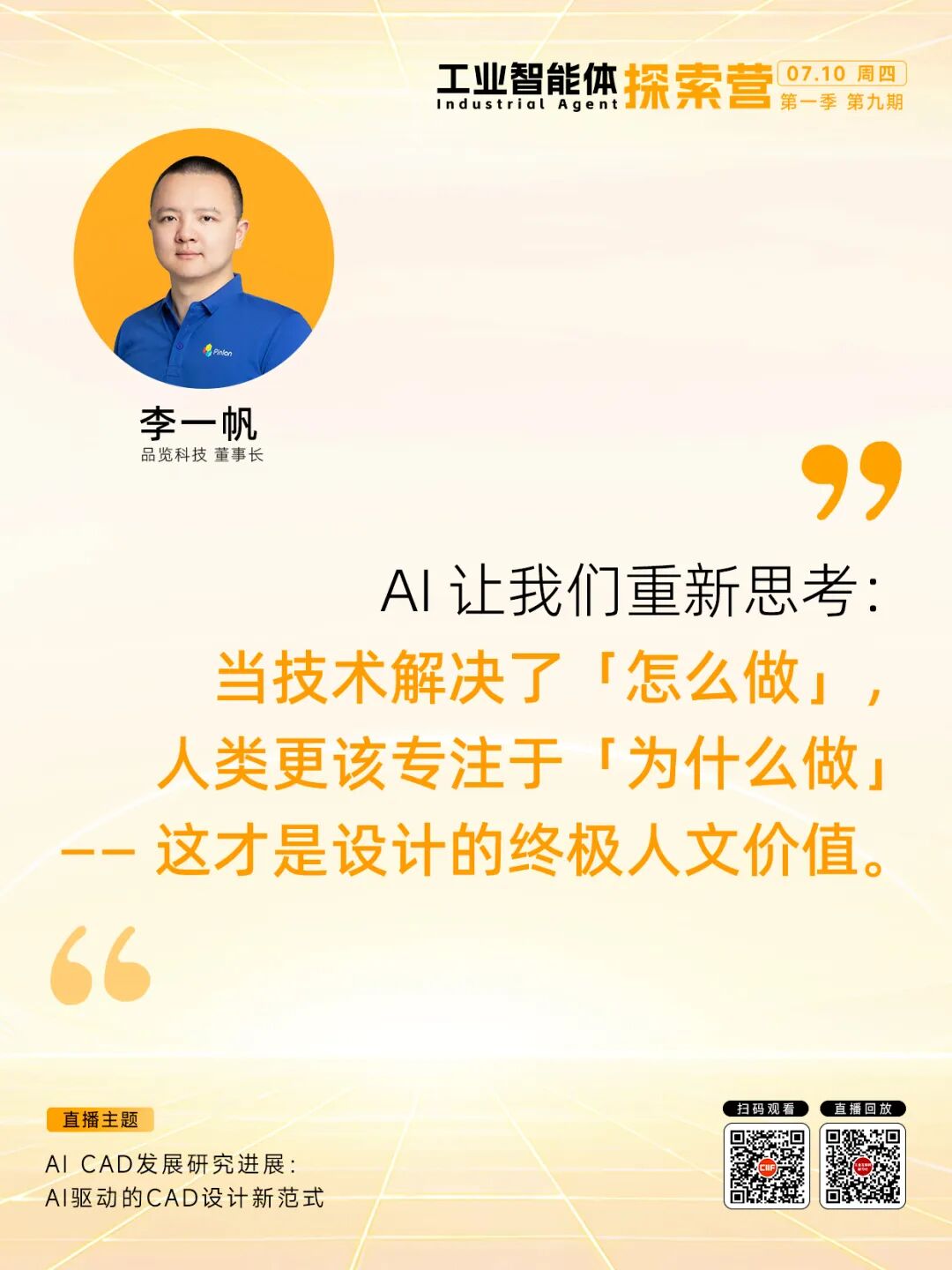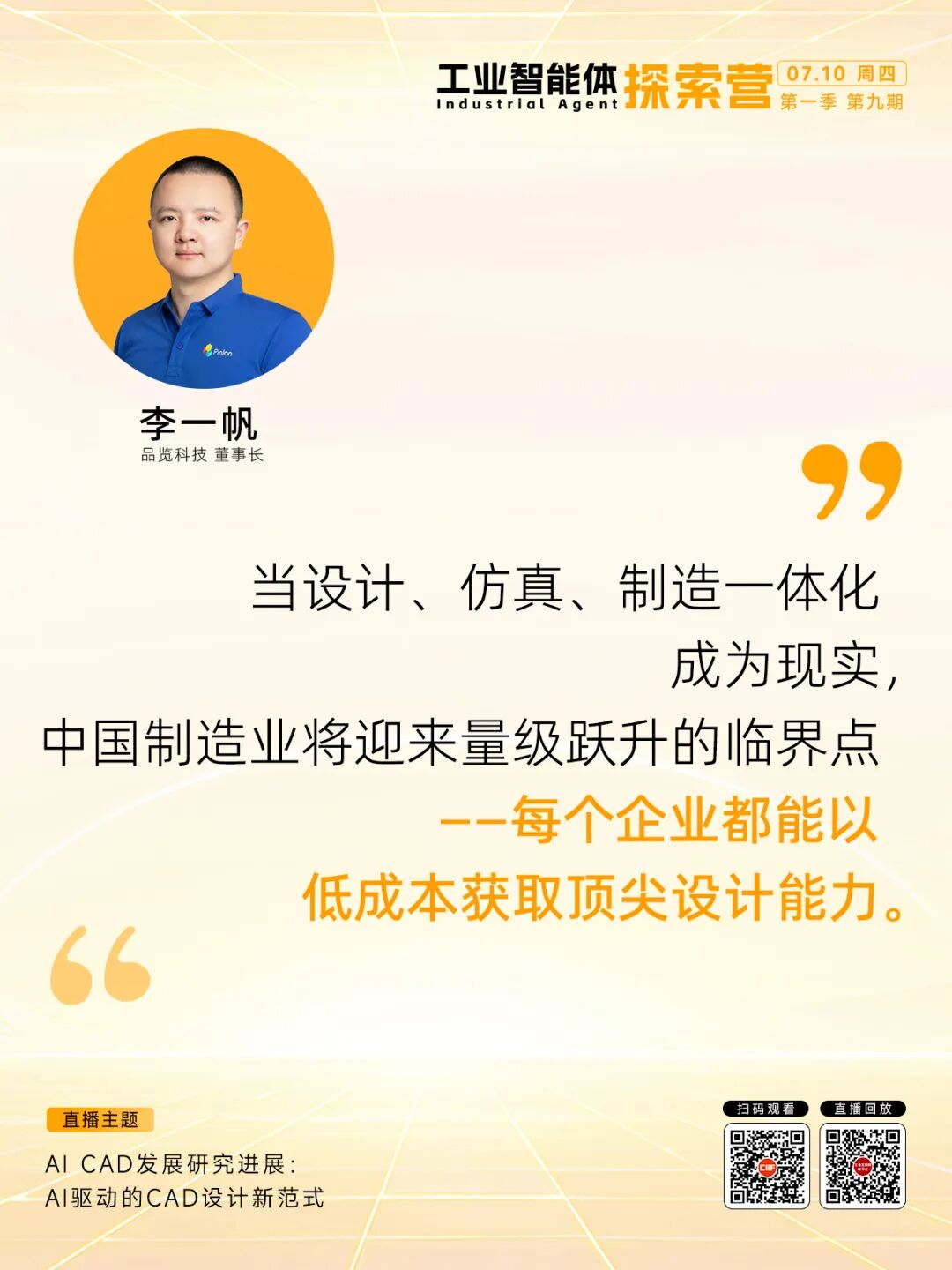 7月10日,「品览科技 董事长 李一帆」做客探索营,分享由AI驱动的CAD设计新范式。