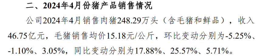 牧原股份,3月8日对外表示,一季度养殖成本为15.8元/公斤,5月15日表示,4月商品猪销售均价14.8元/公斤。温氏股份,5月11日表示,4月猪肉综合养殖成本降至7.2元/斤,5月7日其发布的销售月报显示,4月销售均价15.18元/公斤。新希望,3月18日表示,肥猪出栏成本在16元/公斤左右,5月8日发布的4月销售月报显示,商品猪销售均价15.13元/公斤。