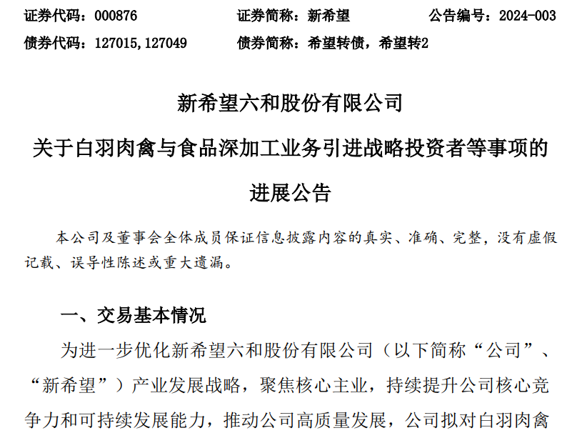 3月27日,新希望表示,预制菜业务已于去年年底从上市公司剥离。5月9日,新希望表示,公司白羽肉禽板块和食品深加工板块已不再计入公司体内。今年年初,新希望分别以27亿、15亿价款将旗下中新食品51%股权、德阳食品67%股权出售给中牧集团和海南晟宸。