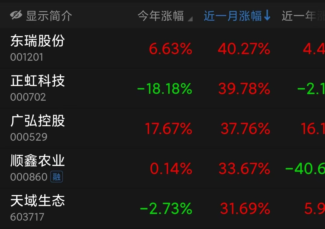 从4月17日以来,A股猪肉概念板块已经涨超22%,2月初以来涨幅超34%。其中,东瑞股份近一个月涨超40%,正虹科技、广弘控股、顺鑫农业、天域生态、天康生物涨超30%,万科A、唐人神、播恩集团、神农集团、立华股份等涨超20%。