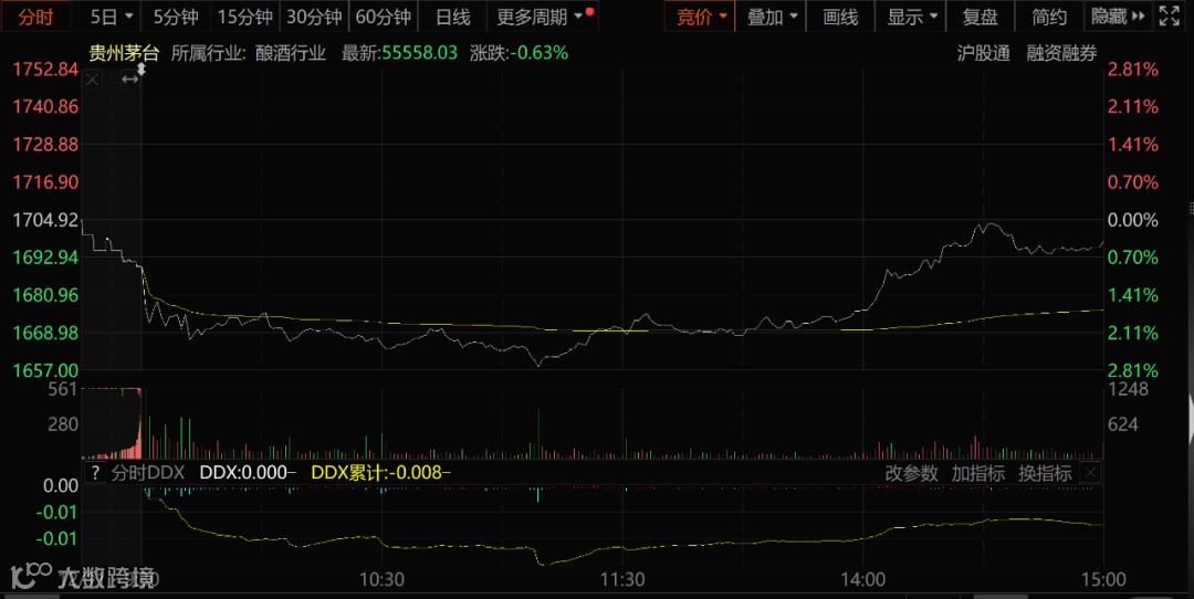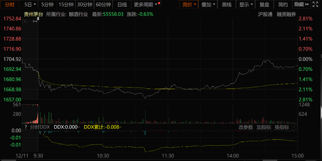 从下图的贵州茅台的分时走势图不难看出,资金下午拉升的意愿还是比较明显,而上图泸州老窖的分时走势图就要弱很多。