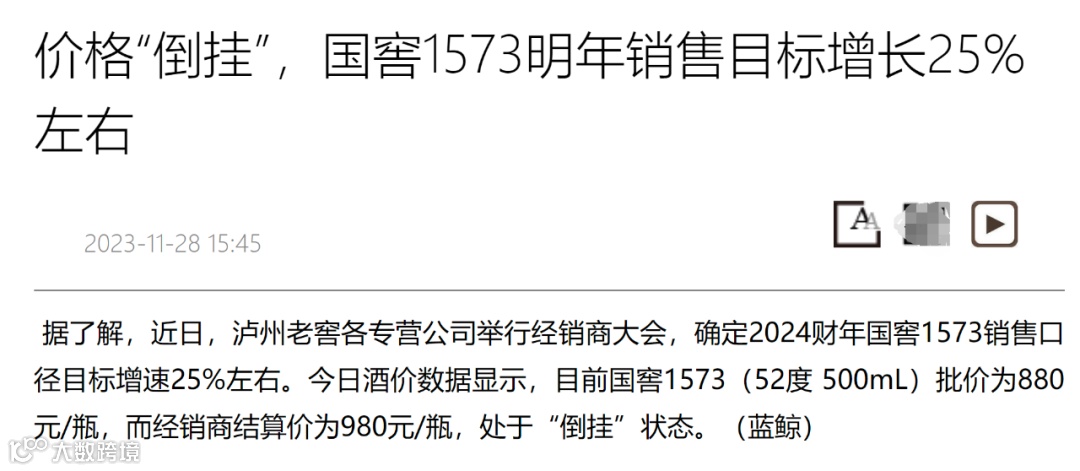 笔者目前在网上看到的消息是,泸州老窖各专营公司日前举行经销商大会,确定2024财年国窖1573销售口径目标增速25%左右。