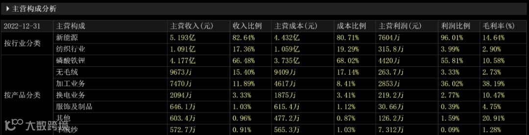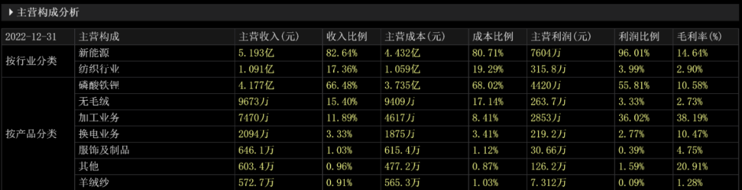 这从公司的主营构成和产品分类中能明显看出来。2022年,中银绒业83%以上的收入都来自新能源,纺织行业收入占比不到18%。具体到单一业务上来看,磷酸铁锂占公司收入的比重高达三分之二。