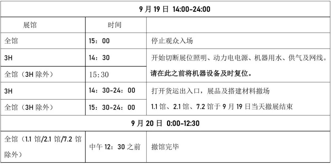 展会撤展时间为9月19日15:00—9月20日12:30,(3H时间为9月19日14:30起)
