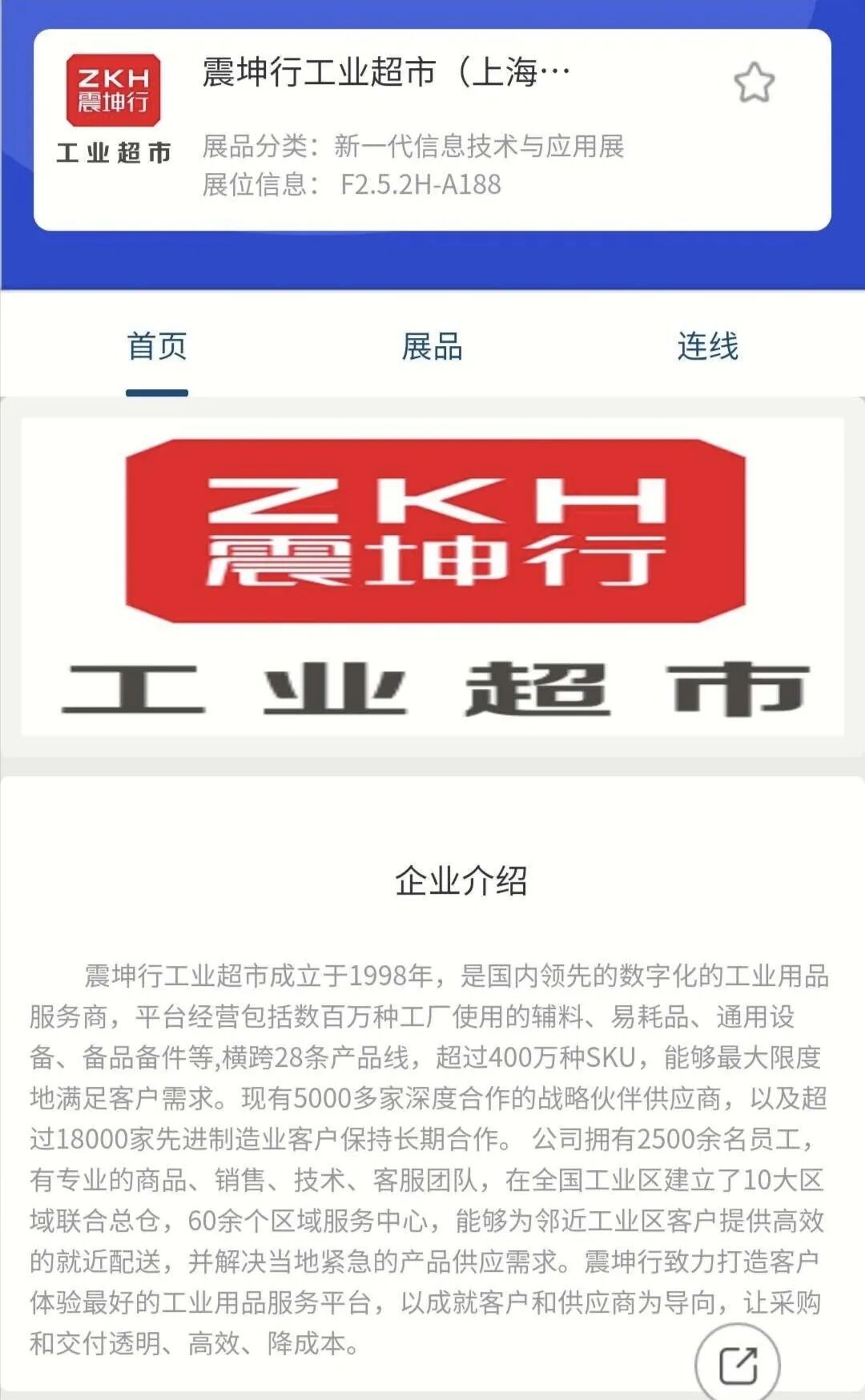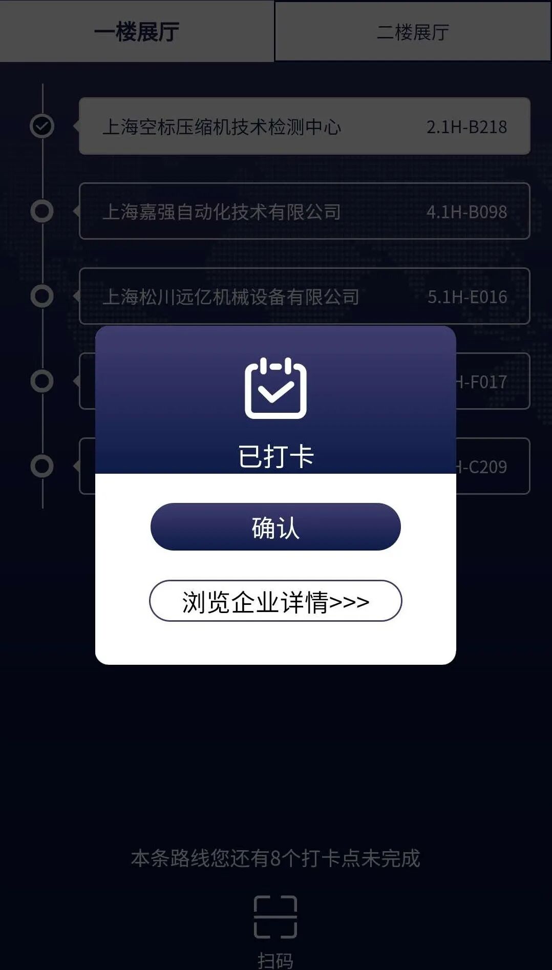打卡成功页面跳出后,点击“浏览企业详情”,即可跳转到该展商的线上工博会详情页,一键获取该展商的企业介绍和展品亮点。