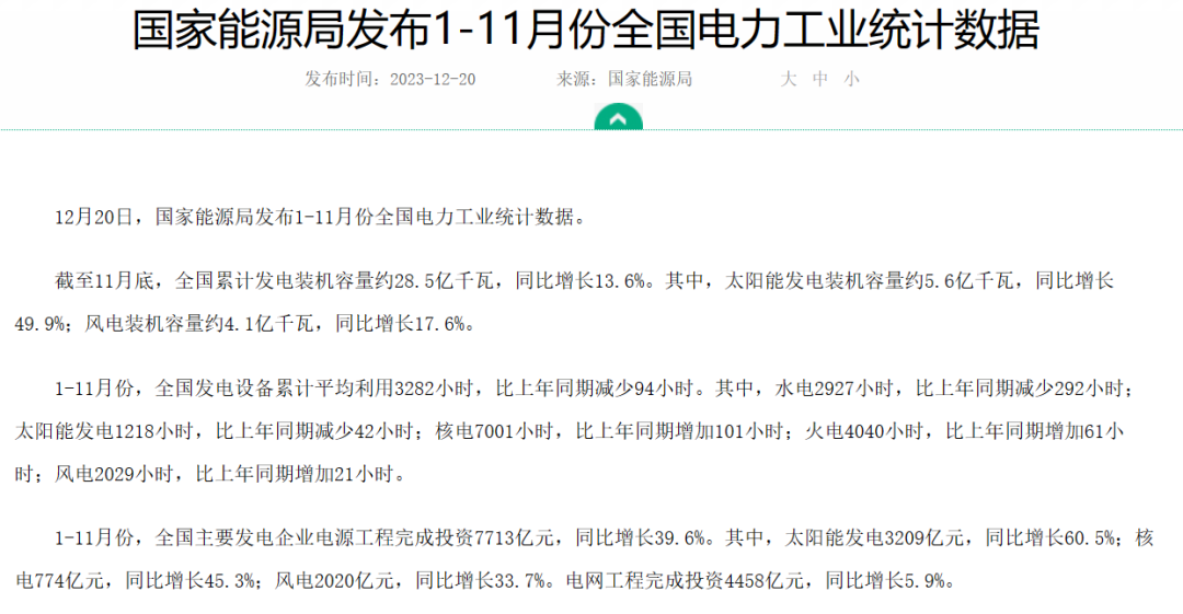 12月20日,国家能源局发布了今年1-11月份全国电力工业统计数据。数据显示,太阳能发电累计装机量约5.6亿千瓦、同比增长49.9%,太阳能发电新增装机量约1.6亿千瓦、同比增长149.39%,太阳能发电平均利用1218小时、同比减少42小时,太阳能发电完成投资3209亿元、同比增长60.5%。单11月份,全国新增太阳能发电装机21.3GW、同比增长185%。