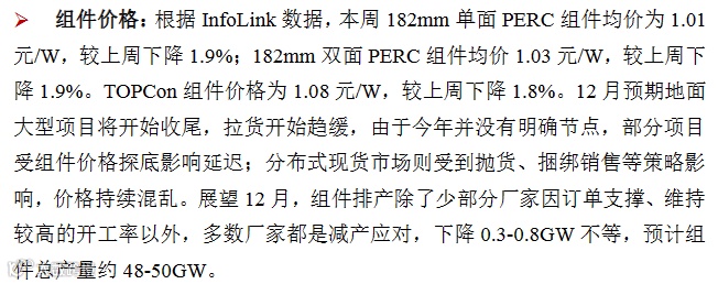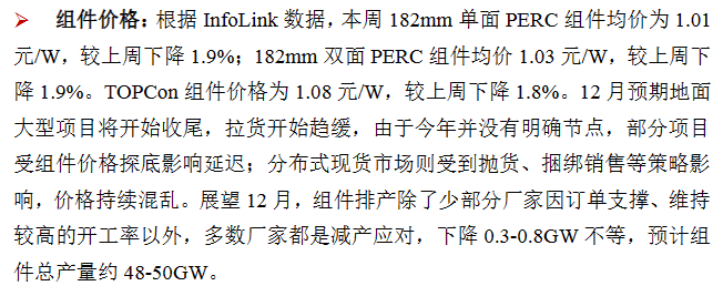 山西证券研报显示,截至12月4日的一周,多晶硅致密料均价65元/公斤、较上一周下降3%,虽然签单氛围有所恢复但签单价格持续下降;硅片价格基本持稳;M10电池片均价0.42元/W,较上一周下降6.7%;PERC组件均价1.01元/W,较上一周下降1.8%。