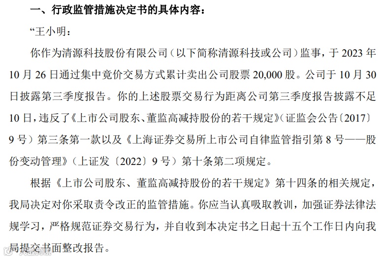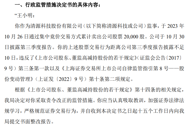 12月1日,厦门证监局对公司监事王小明实施责令整改措施,原因是其在距离公司三季报披露不足10日期间,通过集中竞价卖出公司2万股,实现盈利16.45万元。该行为违反了减持新规。