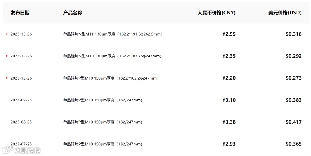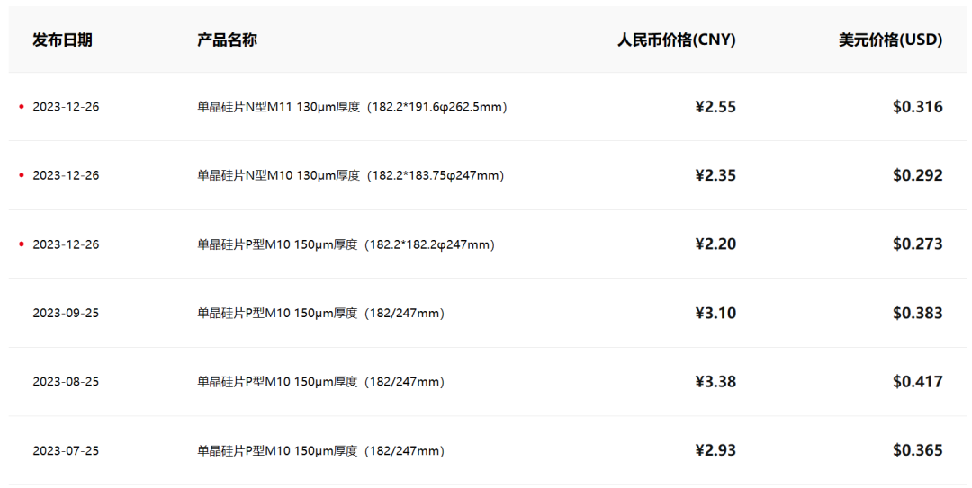 就在国家能源局发布的数据一周后,12月26日,隆基绿能再次调整了其硅片价格,N型M11、M10分别报价2.55元、2.35元。P型M10 150μm厚度报价2.2元,较三个月前的报价3.1元降价近30%,而今年初的时候这一产品的报价还是5.4元,年内降价幅度近60%!