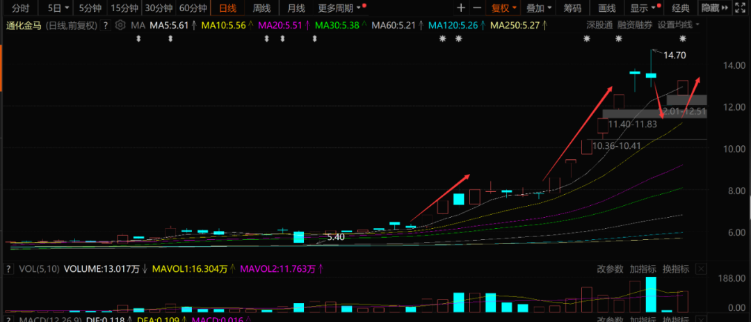 自此,通化金马的近期股价也成为这种波浪式上涨的形态。