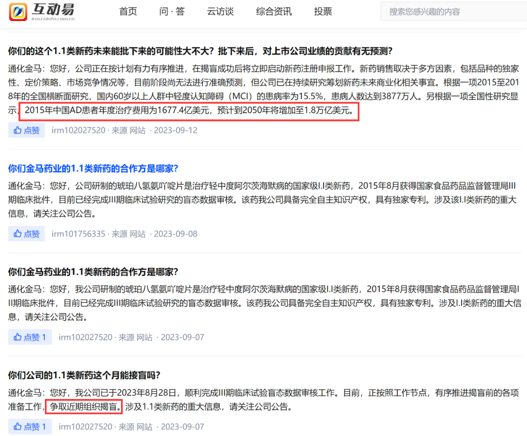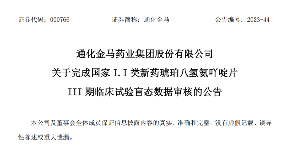 当时的这波涨停,源自于公司8月30的发布的公告。该公告称,通化金马的全资子公司长春华洋研发出的可以治疗轻度、中度阿尔茨海默症的药物琥珀八氢氨吖啶片正式完成了三期临床试验盲态数据审核。