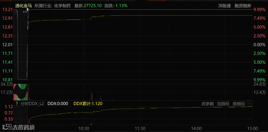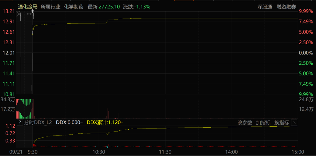 没有任何悬念,通化金马的股价在9月21日开盘瞬间就涨停,并且全天牢牢封死涨停板!