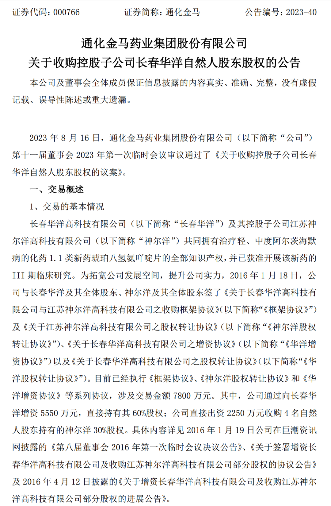 有意思的是,就在短短两周前的8月16日,通化金马才发布公告,称以9360万收购控股子公司长春华洋剩余40%股权。