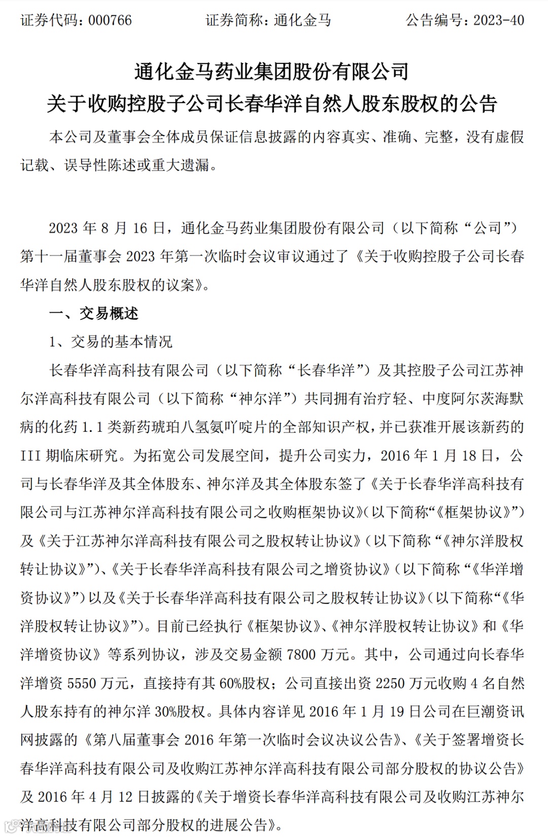 自此,通化金马对长春华洋的持股比例从60%上升到100%,实现了全资控股。