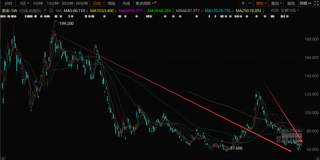 目前港股的蔚来汽车,股价为59港元,从8月份之后股价已经腰斩,距离历史最高价199港元跌了70%。而销量明显更好的理想汽车,目前股价为134港元,较历史最高价185港元跌了不到28%。