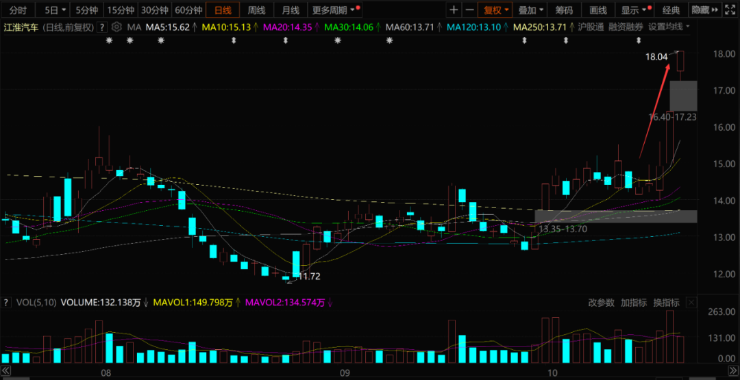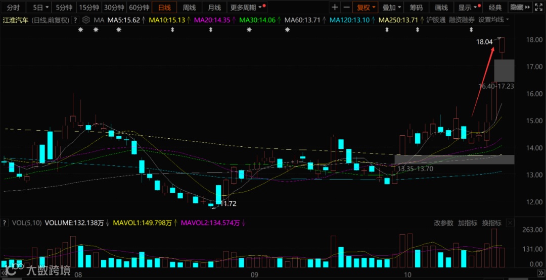 这几天,已经涨至高位的赛力斯出现了盘中跳水震荡的走势,而股价处在相对低位的江淮汽车则连续两个涨停!