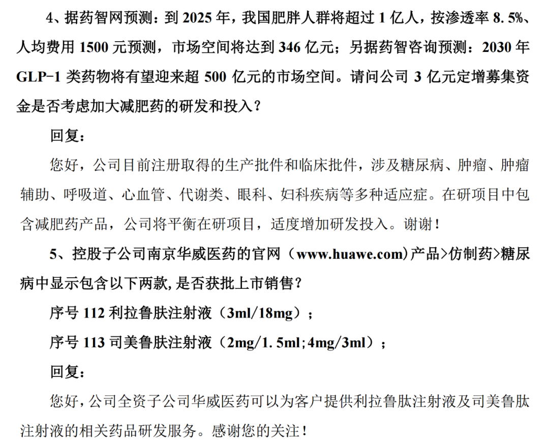 博瑞医药负责投资者关系的工作人员说,这款药物尚处于研发阶段,减重和2型糖尿病治疗两项适应症均仅获得Ⅱ期临床试验伦理批件。