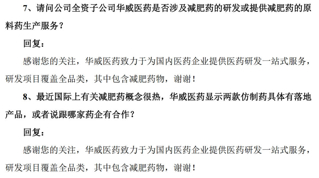 1、减肥药项目是受客户委托开发的,已进入临床试验阶段,还没有相关药品的生产及销售业务。减肥药项目在2022年度收入仅占公司全年营业收入的0.3%,不会对公司业绩产生重大影响。