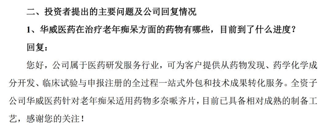 另外,百花医药在第一个问题的回复里还透露其全资子公司生产治疗老年痴呆症的药物多奈哌齐片。