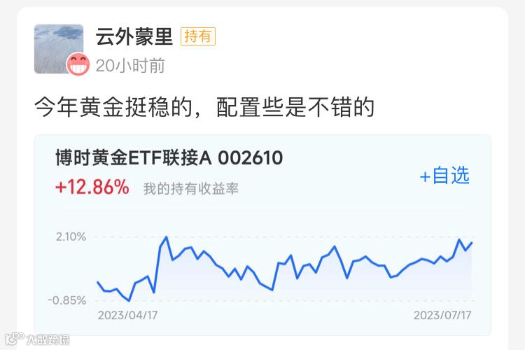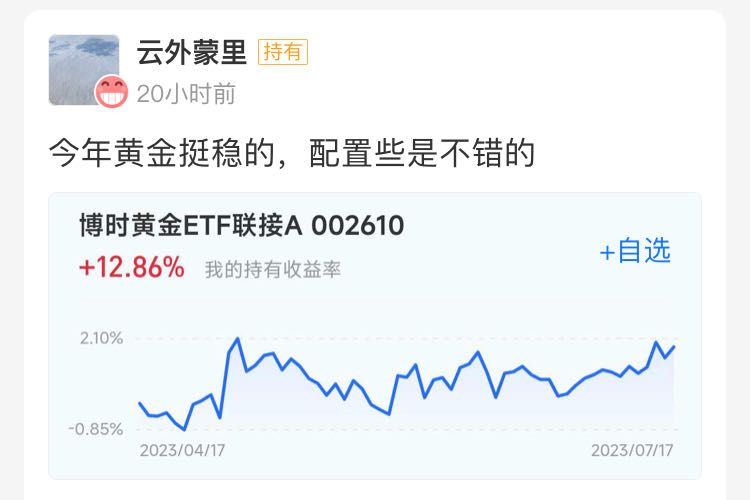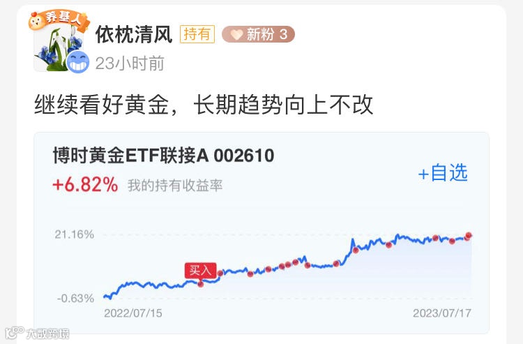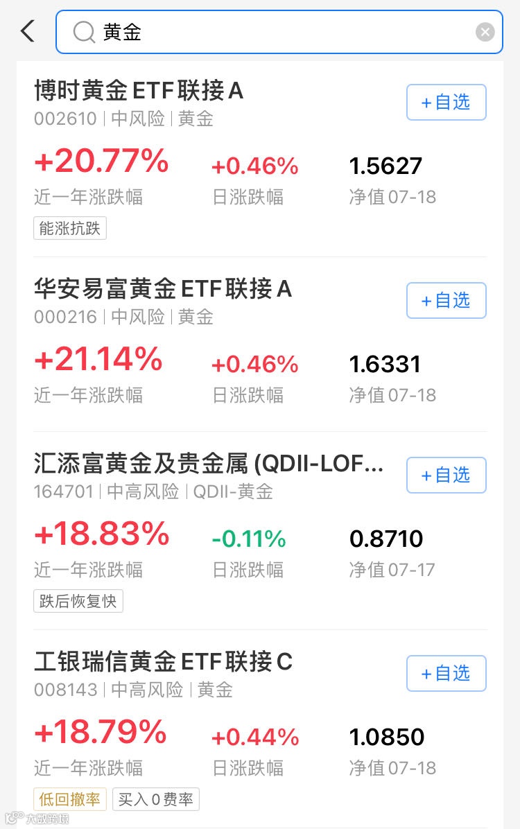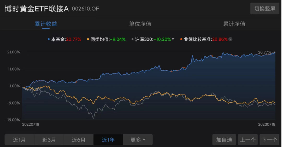以博时黄金ETF联接A为例,近一年涨跌幅为20.77%,最新日涨跌幅为0.46%,截至7月18日的基金净值是1.5627,收益率跑赢沪深300超30%。