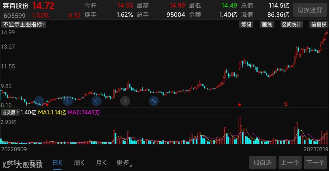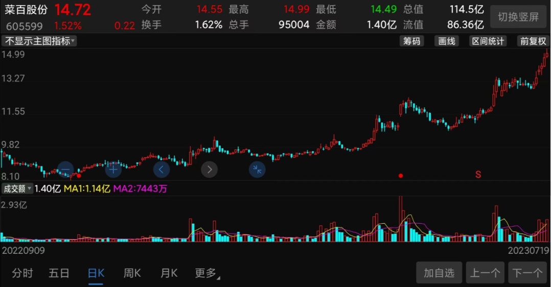 从去年十月之后,随着金价反弹并在今年5月逼近历史新高,菜百股份的股价同步从低位一路狂涨至今天盘中最高14.99元,大涨超85%,最新市值已经超过114亿!
