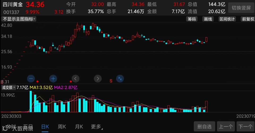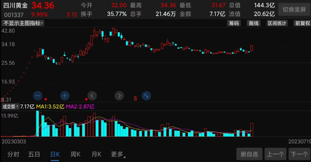 菜百股份上市的时机就没有四川黄金好,菜百股份上市时正值金价自高位下跌,它上市一周后就从高位的17.68元开始一路暴跌至2022年10月底的最低8.10元,跌幅超过54%。