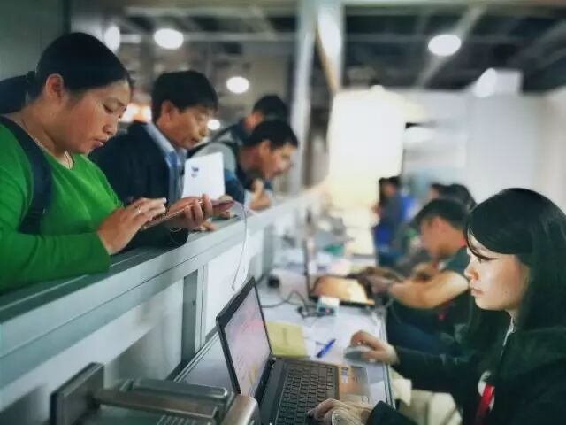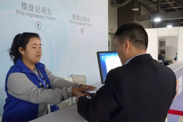 专业观众在服务人员指引下有条不紊的进行入场登记