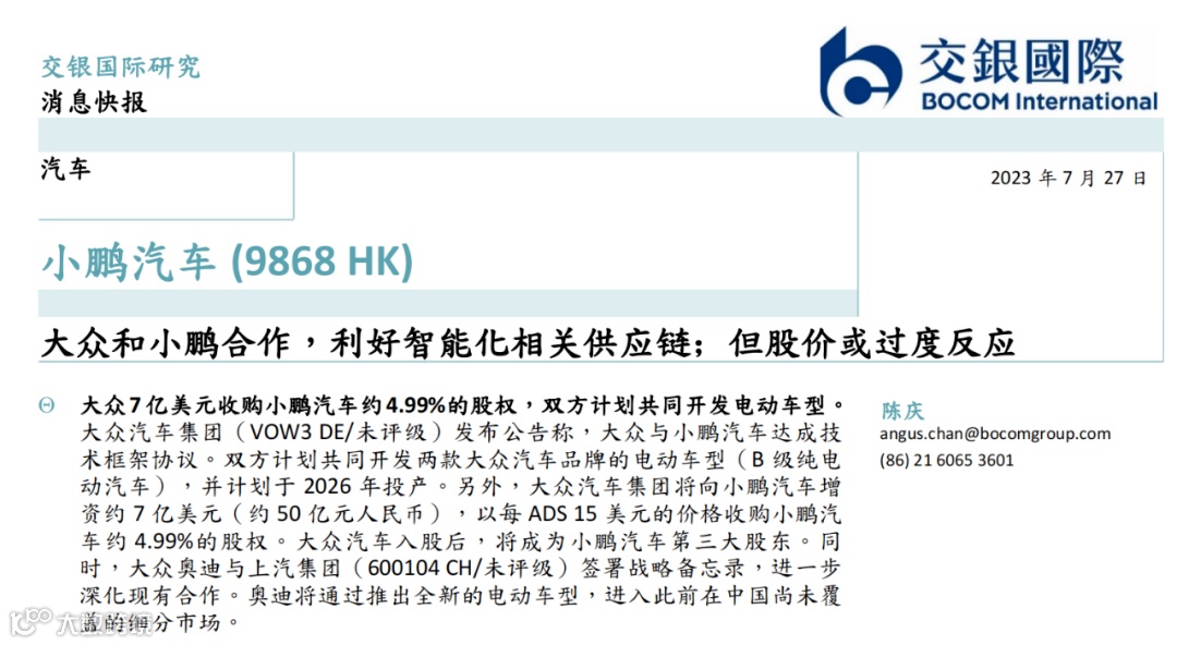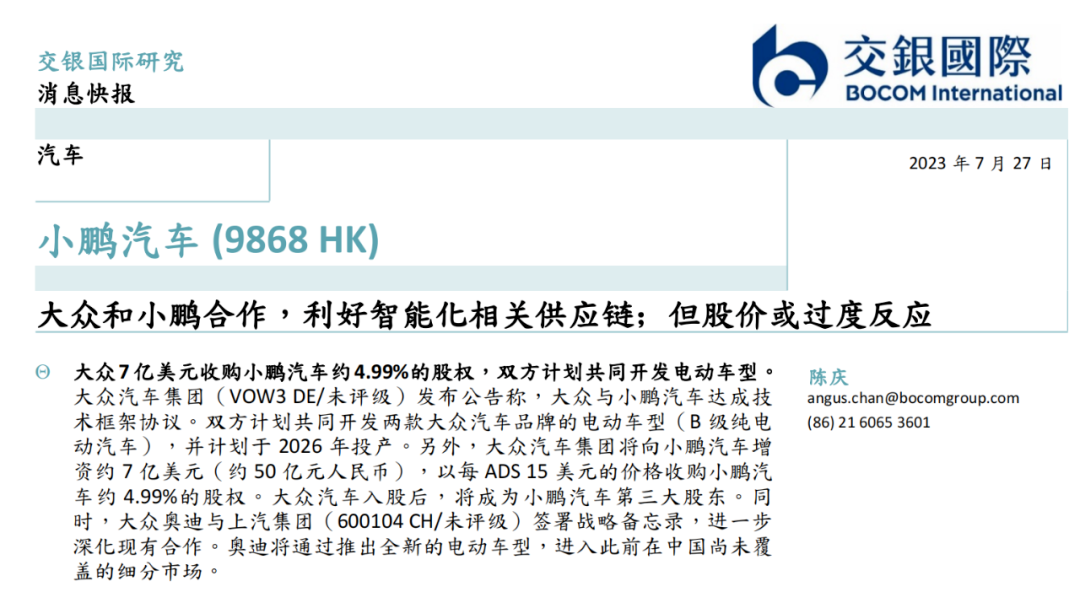 这篇研报的标题为《大众和小鹏合作,利好智能化相关供应链;但股价或过度反应》。
