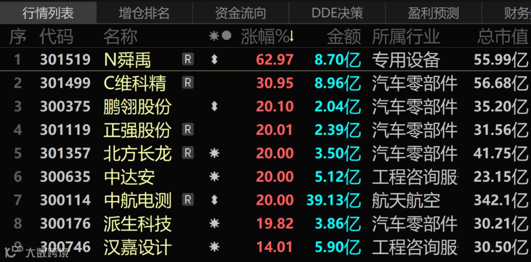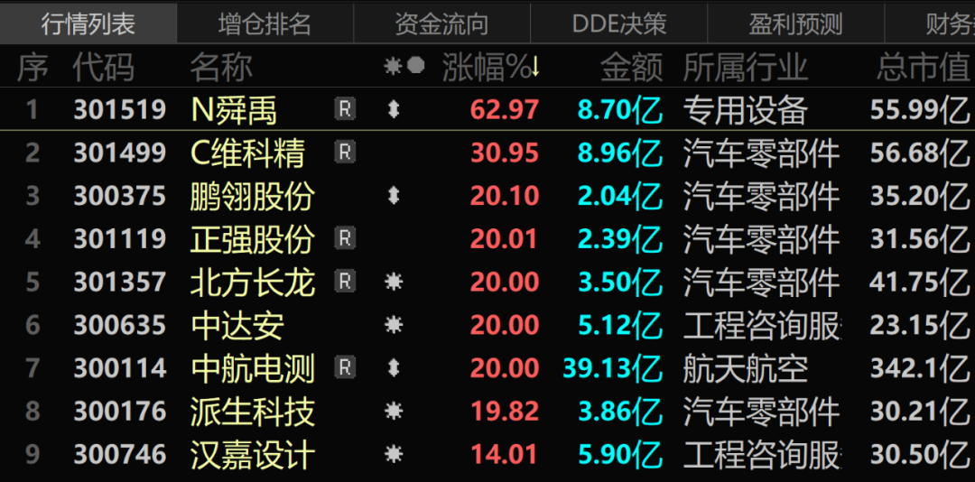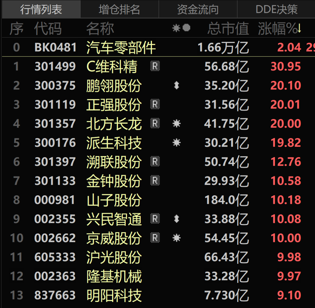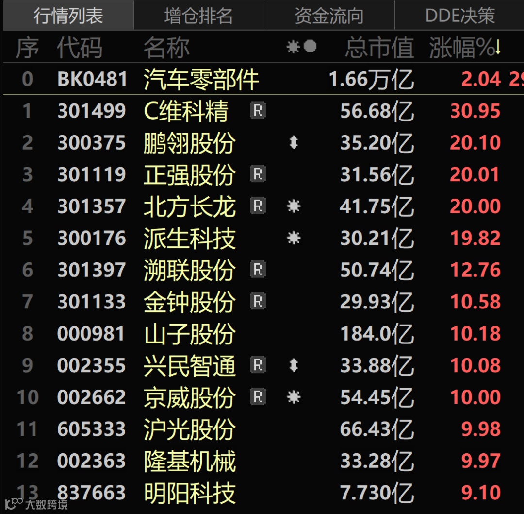 如果看今天的A股涨幅榜,最前面20cm涨停的几乎都被汽车零部件股票包了,可以说是舍我其谁了!