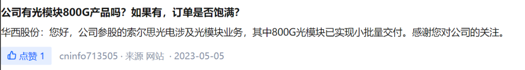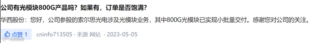 可以看出,目前市场炒作华西股份主要炒的可能是其通过上海启澜持有的索尔思光电,因为索尔思光电有800G光模块产品并且已经小批量交付。这其实与上周被炒的跃岭股份(002725.sz)类似,跃岭股份也是因为间接持股了生产光芯片的中科光电而被市场炒作。