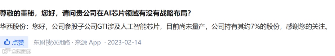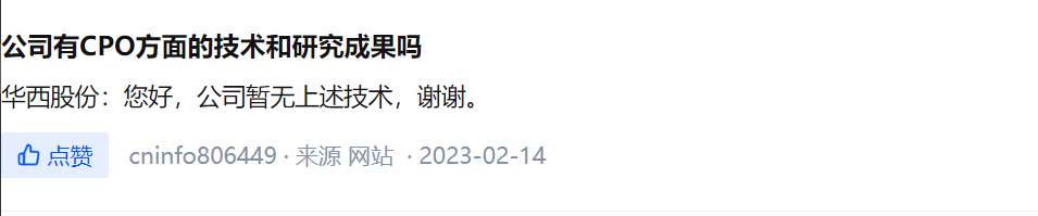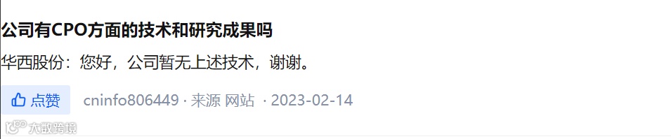 今年2月14日,华西股份在互动平台表示“暂无CPO相关技术”“参股子公司GTI涉及人工智能芯片,目前尚未量产”,到了5月5日又在互动积极表示“参股的索尔思光电涉及光模块业务”。