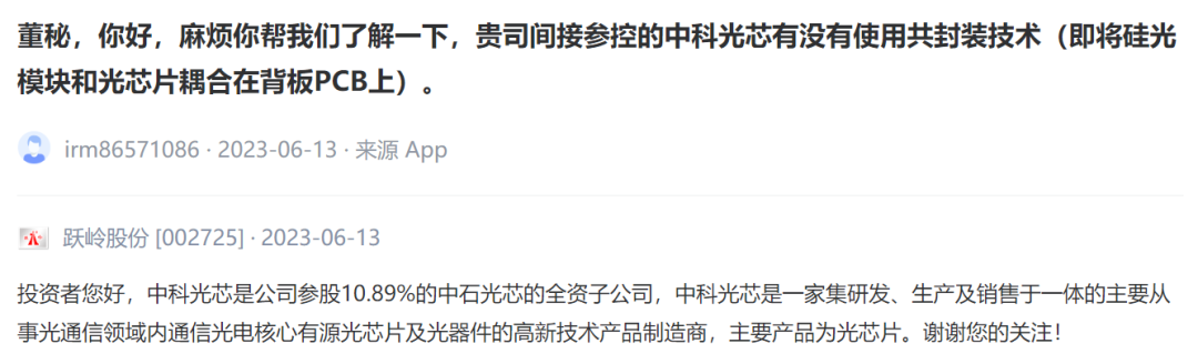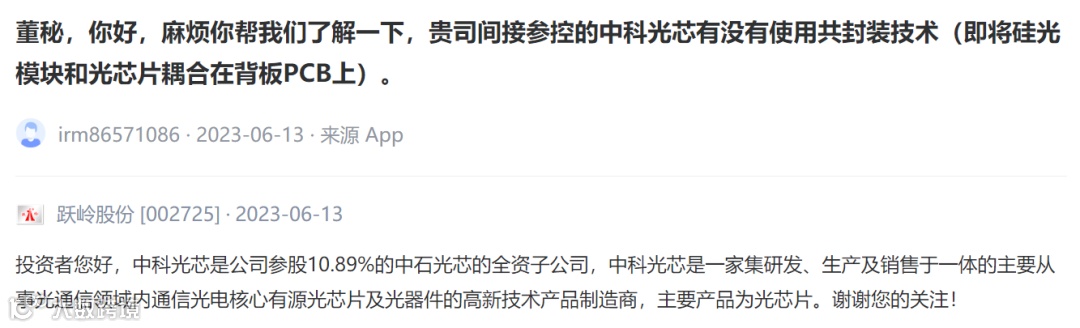 跃岭股份互动平台最新的一条动态显示,有投资询问公司间接参股的中科光芯有没有使用共封装技术,公司的回复是“中科光芯是公司参股10.89%的中石光芯的全资子公司,中科光芯是一家集研发、生产及销售于一体的主要从事光通信领域内通信光电核心有源光芯片及光器件的高新技术产品制造商,主要产品为光芯片。”