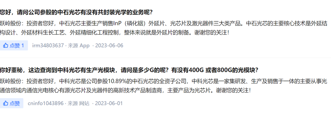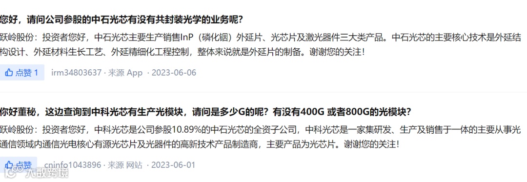 这已经是6月13日的动态了,在公司股价5天4涨停前的6月7日及之前,跃岭股份也曾在互动平台频繁强调参股的中石光芯、其子公司中科光芯涉及光通信、光芯片业务。